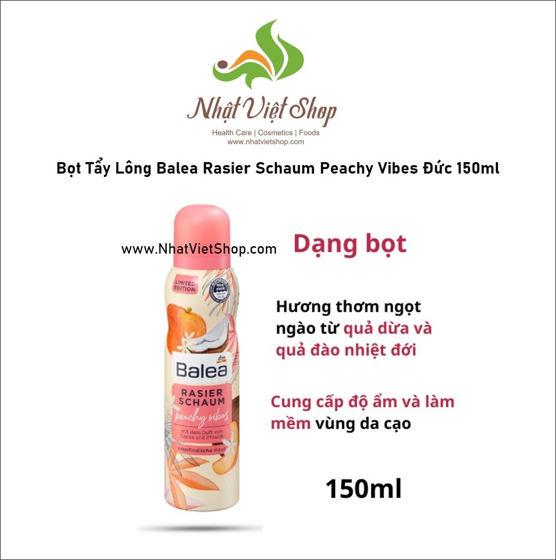 • - Bọt Tẩy Lông Balea Rasier Schaum Peachy Vibes Đức 150ml Hương Đào + Hương Dừa là dòng sản phẩm nội địa Đức cực kì dịu nhẹ, không gây kích ứng hay nổi mẩn sau khi sử dụng.