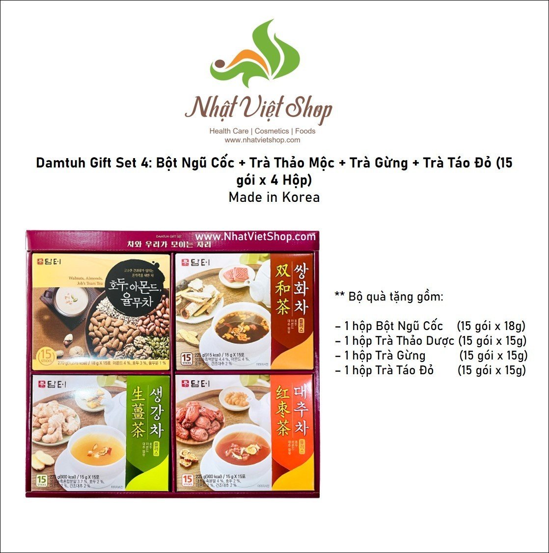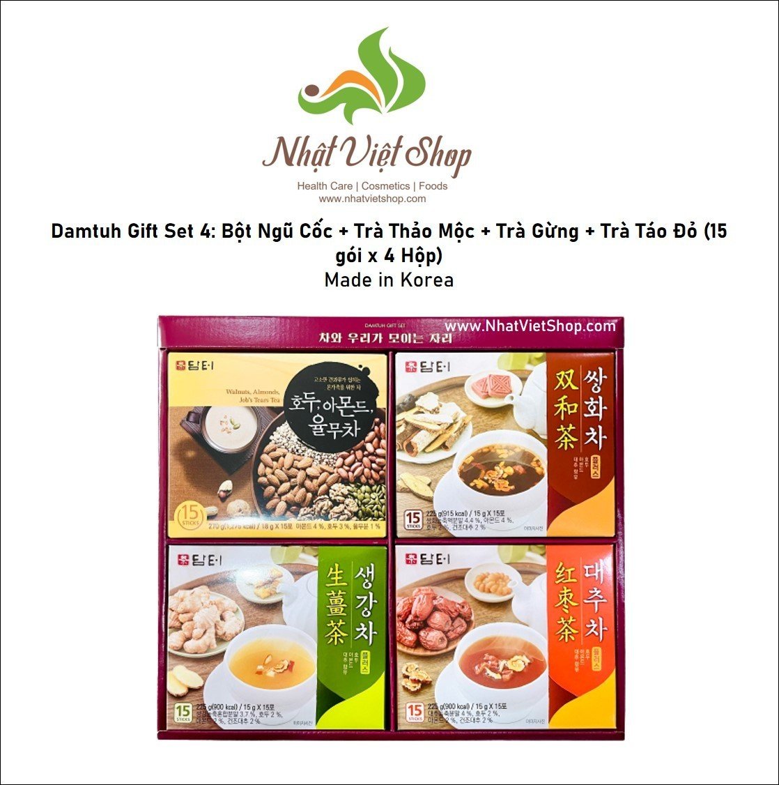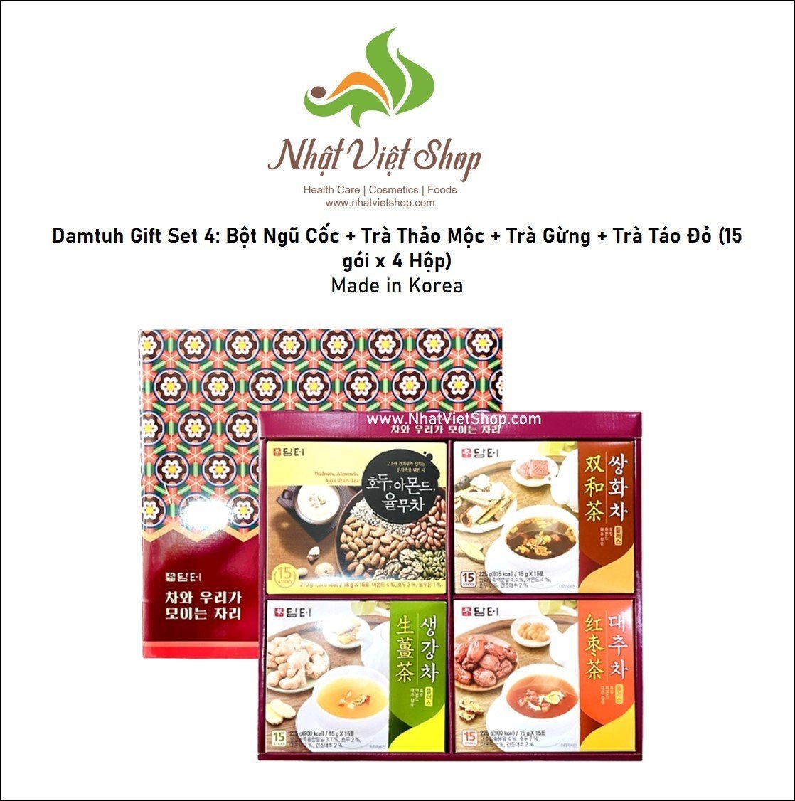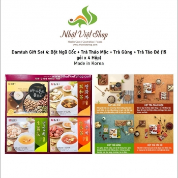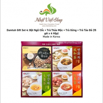 - Damtuh Gift Set 4: Bột Ngũ Cốc + Trà Thảo Mộc + Trà Gừng + Trà Táo Đỏ (15 gói x 4 Hộp) Thương hiệu: DAMTUH //=$row_detail['masp']?>
