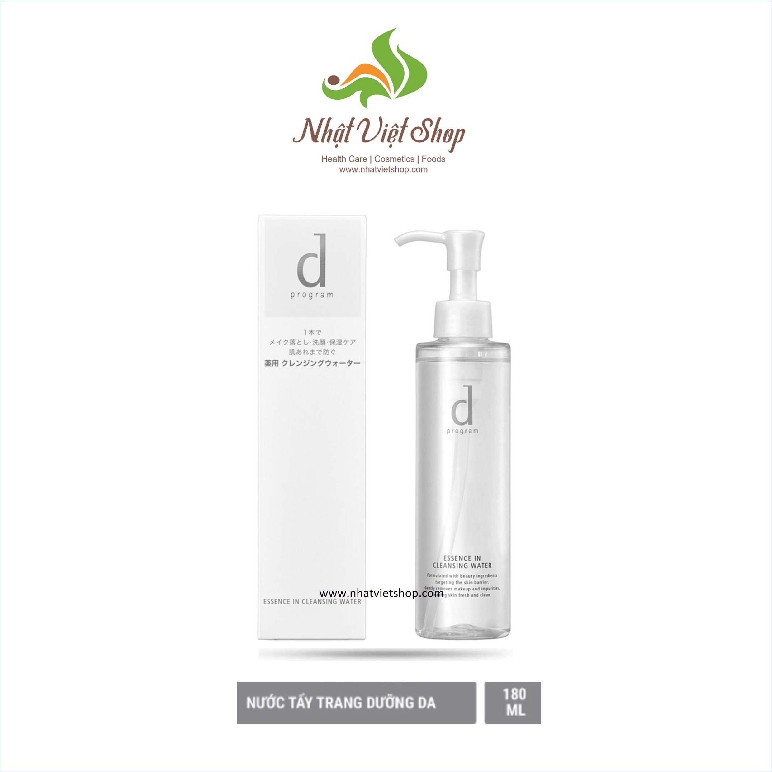 Nước Tẩy Trang Dưỡng Da D Program Essence In Cleansing Water là nước tẩy trang có kết cấu dạng gel lỏng giúp nhẹ nhàng làm sạch lớp trang điểm và bụi bẩn trên da, làm dịu da và kháng viêm, tình trạng da thô ráp được cải thiện, đồng thời duy trì độ ẩm cần thiết cho da mềm mịn tự nhiên ngay sau khi làm sạch thuộc thương hiệu D Program đến từ Shiseido của Nhật Bản.