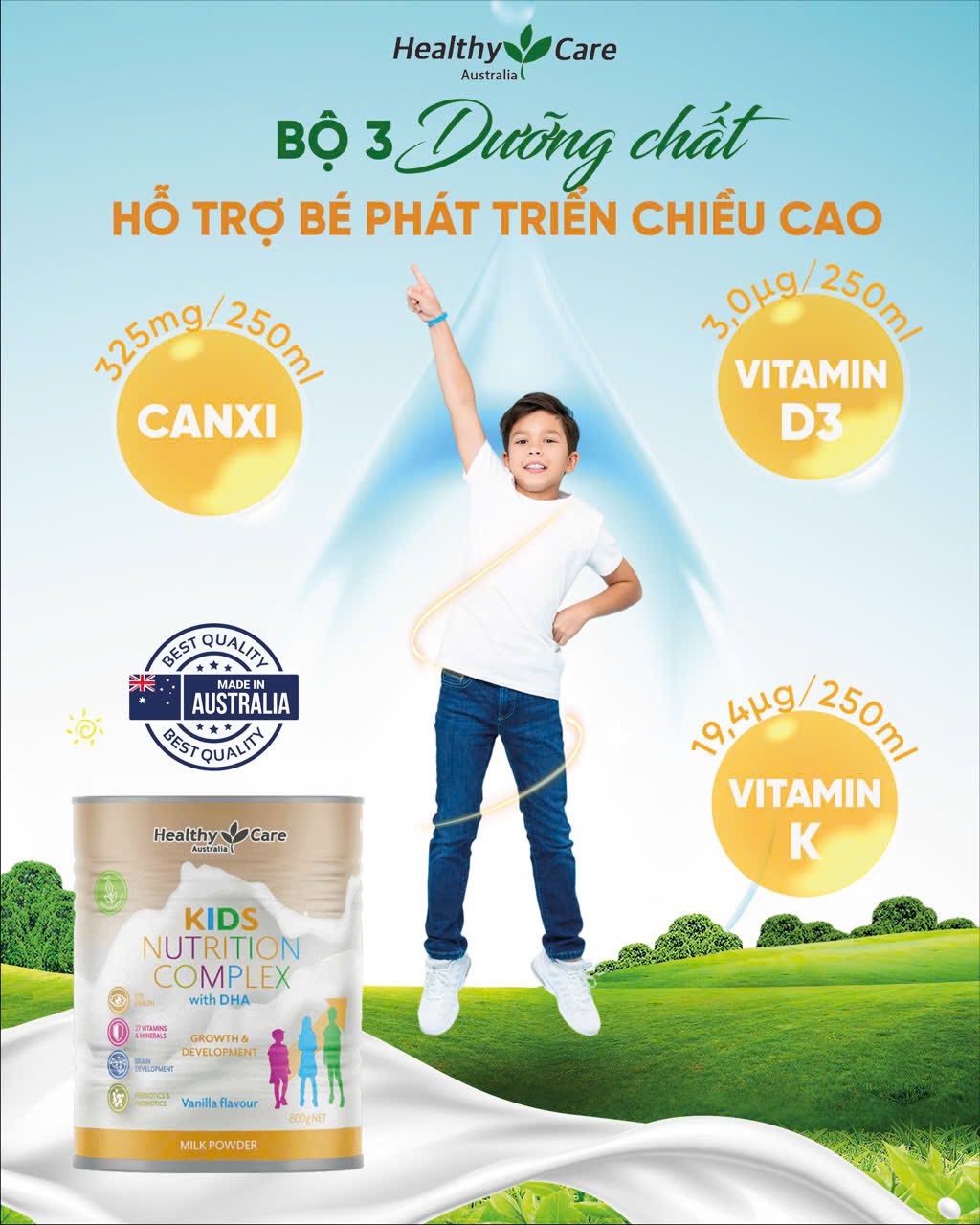 Sữa Healthy Care Kid Nutrition Complex with DHA được nghiên cứu và sản xuất trực tiếp tại Úc, sử dụng nguồn sữa nguyên liệu chất lượng cao, đạt tiêu chuẩn của Hiệp hội Sữa Quốc gia Úc.