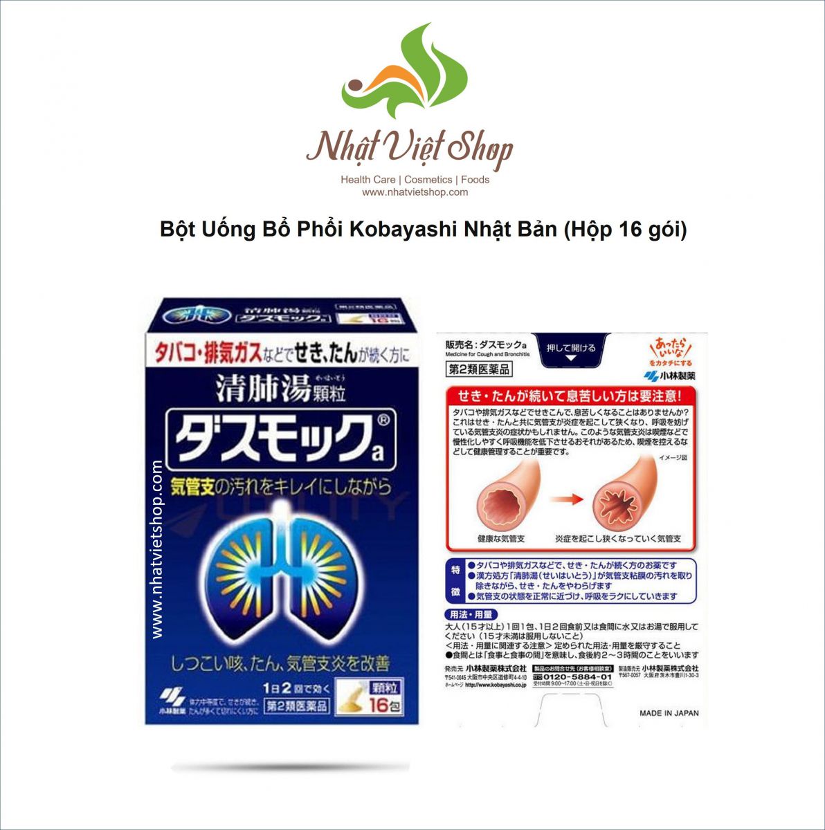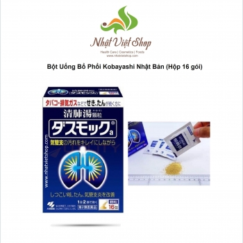 - Bột uống bổ phổi Kobayashi Nhật Bản được điều chế theo phương thuốc cổ truyền với 16 loại thảo dược với khả năng giảm viêm, tan đờm, bổ phế, hỗ trợ đẩy bụi bẩn, vi khuẩn, virus bên trong phổi, củng cố sức khoẻ hệ hô hấp.