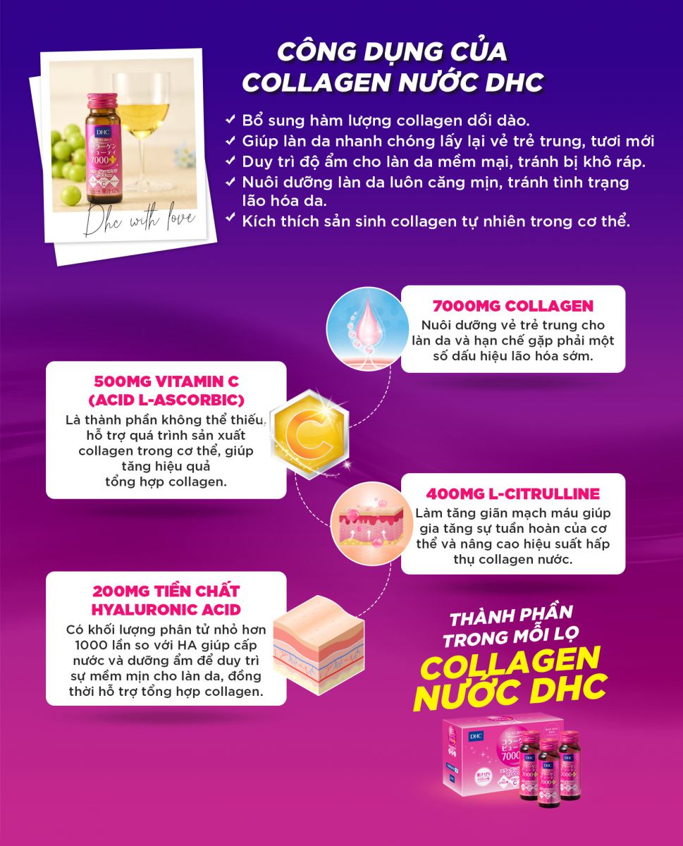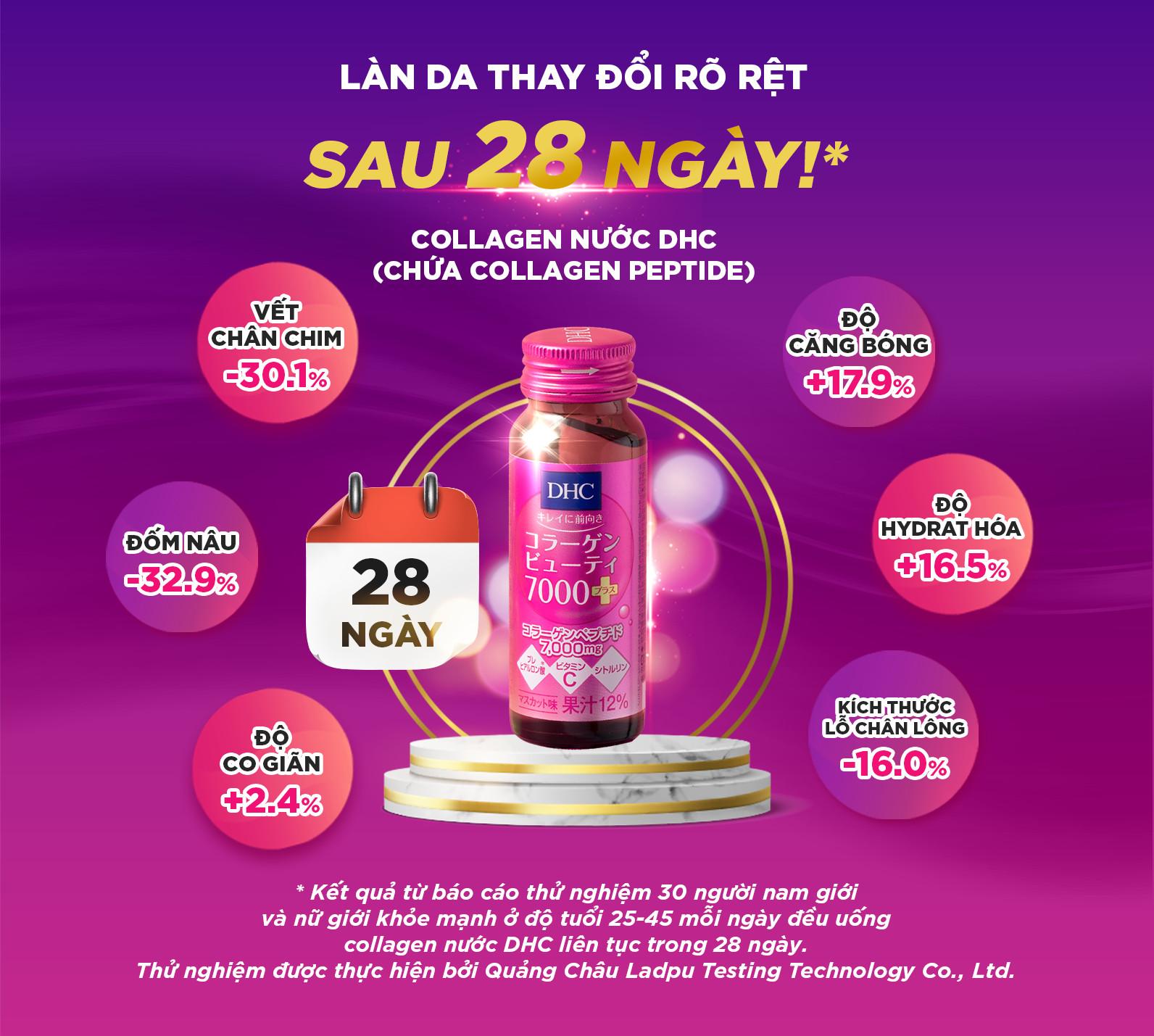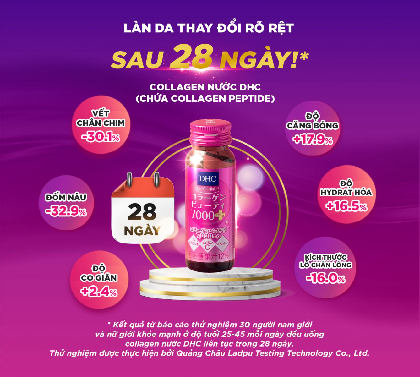 - DHC Collagen giúp bổ sung collagen giúp hỗ trợ cải thiện các vấn đề về tuổi tác trên như: da bớt đàn hồi & bắt đầu chùng nhão, tàn nhang, đồi mồi, lỗ chân lông to...