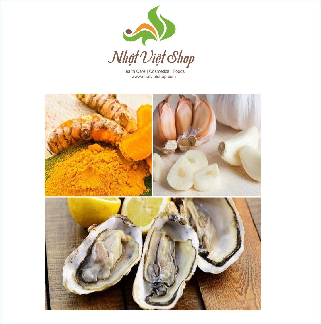 Bột chiết xuất thịt hàu co đặc, bột chiết xuất hến cô đặc, bột nghệ mùa thu cô đặc, bột chiết xuất tỏi cô đặc, Vitamin A, Vitamin D, Vitamin B1, Vitamin B2, Vitamin B6, Vitamin B12, Niacin, Axit folic, Axit pantothenic, Vitamin C, Vitamin E, L-citrulline, L- Methionine, L-cystine, kẽm, sắt, selen.