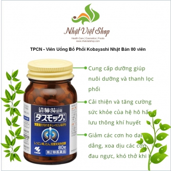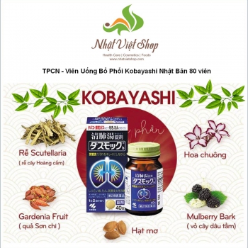 - Viên uống bổ phổi Kobayashi Nhật Bản được điều chế theo phương thuốc cổ truyền với 16 loại thảo dược với khả năng giảm viêm, tan đờm, bổ phế, hỗ trợ đẩy bụi bẩn, vi khuẩn, virus bên trong phổi, củng cố sức khoẻ hệ hô hấp.