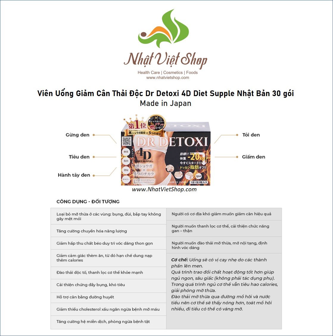 - Giảm cân Dr Detoxi 30 gói được sản xuất tại Nhật Bản trên quy trình hiện đại đạt chuẩn. Viên giảm cân có thành phần từ 5 loại gia vị thiên nhiên quen thuộc: tiêu đen, tỏi đen, dấm đen, gừng đen, và hành tây đen. Viên uống dễ dàng hấp thu và hoàn toàn không gây hại cho dạ dày. Ngược lại, khi bổ sung, Detoxi còn giúp hỗ trợ gan thải độc tố, tăng cường miễn dịch, phòng ngừa và giảm ung thư, mỡ máu,... Do đó bạn hãy yên tâm khi sử dụng.